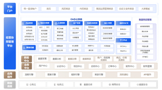 經營管理協同平臺基于公司內部管控相關問題和需求,建立標準化框架體系,從頂層強化內部管控數字化水平。平臺以構建多模塊、全渠道、共生態的數字化管理體系為核心目標,以“微服務架構+中臺技術”為技術支撐,提供“云+數+智”融合的一體化服務,驅動公司內部管控模式變革,加速推動數字化轉型進程。從內控辦公標準化、數據管理集成化和風控管理數字化的角度開展三大模塊建設,構建統一標準化的數字化經營管理協同框架體系,打破數據孤島,實現經營數據實時展示、可視化分析,推動實現數據集成化、辦公數字化、業財一體化、風控智能化。