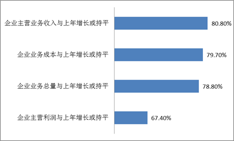 調(diào)查顯示,主營業(yè)務(wù)收入較上年增長的樣本企業(yè)占50.5%,較上年增長或持平的占80.8%;主營業(yè)務(wù)成本較上年增長的占46.8%,較上年增長或持平的占79.7%;主營利潤較上年增長的占47.4%,較上年增長或持平的占67.4%;業(yè)務(wù)總量較上年增長的占47.1%,較上年增長或持平的占78.8%。