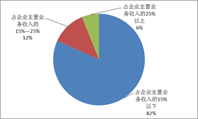 大部分企業(yè)(82%)繳納的法定稅費(fèi)占企業(yè)主營業(yè)務(wù)收入的15%以下,12.2%的企業(yè)占收入的15%-25%,還有6.1%的企業(yè)占收入的25%以上,如圖所示。