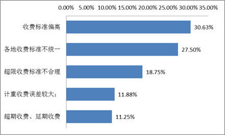 調(diào)查顯示,30.6%的樣本企業(yè)反映過路過橋費(fèi)收費(fèi)標(biāo)準(zhǔn)偏高,27.5%的反映各地收費(fèi)標(biāo)準(zhǔn)不統(tǒng)一,18.8%的反映超限收費(fèi)標(biāo)準(zhǔn)不合理,11.9%的反映計重收費(fèi)誤差較大,11.3%的反映存在超期收費(fèi)、延期收費(fèi)問題。