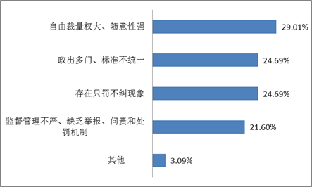 調(diào)查顯示,關(guān)于目前公路罰款問題,29%的企業(yè)認(rèn)為自由裁量權(quán)大、隨意性強(qiáng),24.7%的企業(yè)認(rèn)為政出多門、標(biāo)準(zhǔn)不統(tǒng)一,24.7%的企業(yè)認(rèn)為存在只罰不糾的現(xiàn)象,21.6%的企業(yè)認(rèn)為監(jiān)督管理不嚴(yán)、缺乏舉報、問責(zé)和處罰機(jī)制。
