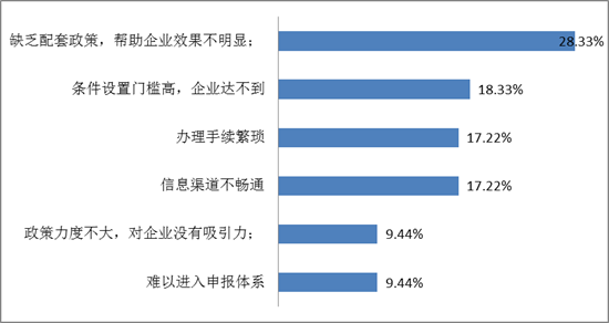 落實(shí)情況不好的主要原因:28.3%的企業(yè)反映缺乏配套政策,幫助企業(yè)效果不明顯;18.3%的反映條件設(shè)置門檻高,企業(yè)達(dá)不到;17.2%的反映辦理手續(xù)繁瑣;17.2%的反映信息渠道不暢通;9.4%的反映政策力度不大,對企業(yè)沒有吸引力;9.4%的反映難以進(jìn)入申報體系。