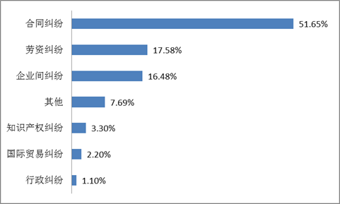關(guān)于企業(yè)自身的法律情況,50%的企業(yè)表示企業(yè)有專門的法律部門;47%的企業(yè)表示企業(yè)無法律部門,但有相關(guān)部門代管法律事項。調(diào)查顯示,60%的企業(yè)反映最近三年有法律糾紛,法律糾紛主要涉及合同糾紛51.7%、勞資糾紛17.6%、企業(yè)間糾紛16.5%等。