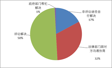 企業(yè)發(fā)生法律糾紛,主要解決途徑為訴訟解決50%、法律部門跟對方溝通協(xié)商32%、非訴訟途徑自行解決17%等。