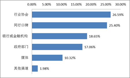 調(diào)查顯示,90%的企業(yè)建立了誠信制度和風(fēng)險防范體系情況。企業(yè)獲得誠信信息的渠道主要為行業(yè)協(xié)會26.6%、同行口碑25.4%、銀行或金融機(jī)構(gòu)18.7%、政府部門17.1%、媒體10.3%等。