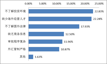 企業(yè)進(jìn)行海外市場拓展仍有很多問題,主要表現(xiàn)為不了解投資環(huán)境22.8%、缺少海外經(jīng)營人才22.3%、不了解國外法律17.9%、缺乏商務(wù)信息12.5%、審批程序復(fù)雜12%、外匯管制嚴(yán)格10.9%等。