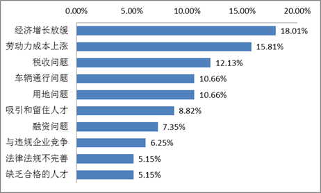 對于未來三年阻礙企業(yè)發(fā)展的挑戰(zhàn),調(diào)查顯示,第一位挑戰(zhàn)是經(jīng)濟(jì)增長放緩,其次是勞動力成本上漲,第三是稅收問題,第四是車輛通行問題,第五是用地問題。此外還有吸引和留住人才、融資問題、法律法規(guī)不完善、缺乏合格的人才等。