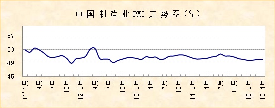 中國物流與采購聯合會、國家統計局服務業調查中心發布的2015年4月份中國制造業采購經理指數(PMI)為50.1%,同上月持平。主要分項指數有升有降,波動不大。綜合來看,當前企業采購活動增加,生產恢復性回升,市場價格低位回升,小企業生產經營形勢有所好轉,經濟走勢筑底趨穩。