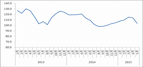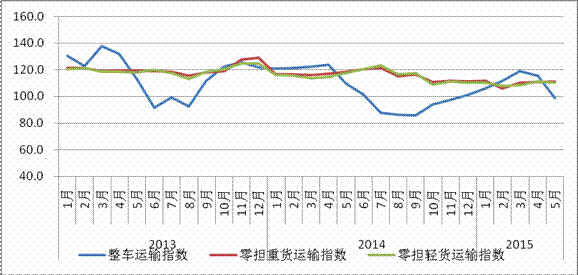 由中國物流與采購聯合會和廣東林安物流集團聯合調查的中國公路物流運價指數2015年5月為103.4點,比上月下降9.0%,比年初下降1.4%,比去年同期下降8.7%。