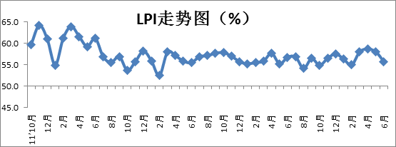 中國物流與采購聯合會發布的2015年6月份中國物流業景氣指數(LPI)為55.7%,比上月回落2.3個百分點。各分項指數中, 業務總量指數、新訂單指數、庫存周轉次數指數、設備利用率指數、固定資產投資完成額指數、從業人員指數和業務活動預期指數回落;平均庫存量指數、資金周轉率指數、物流服務價格指數、主營業務利潤指數和主營業務成本指數回升。