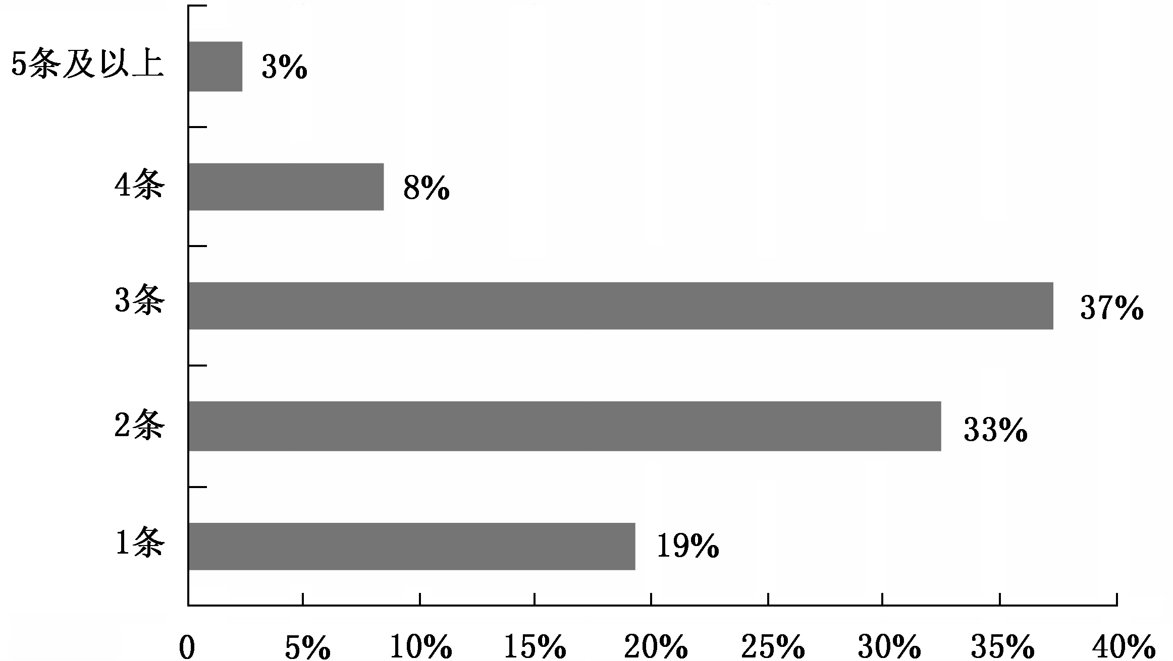 一一根據《規范》,統計物流園區周邊5公里以內的高速公路、國道、省道總條數情況,從圖10可知,70%的物流園區5公里以內有2~3條公路,臨近四條及以上公路的物流園區占比為11%。物流園區公路便利性總體良好。