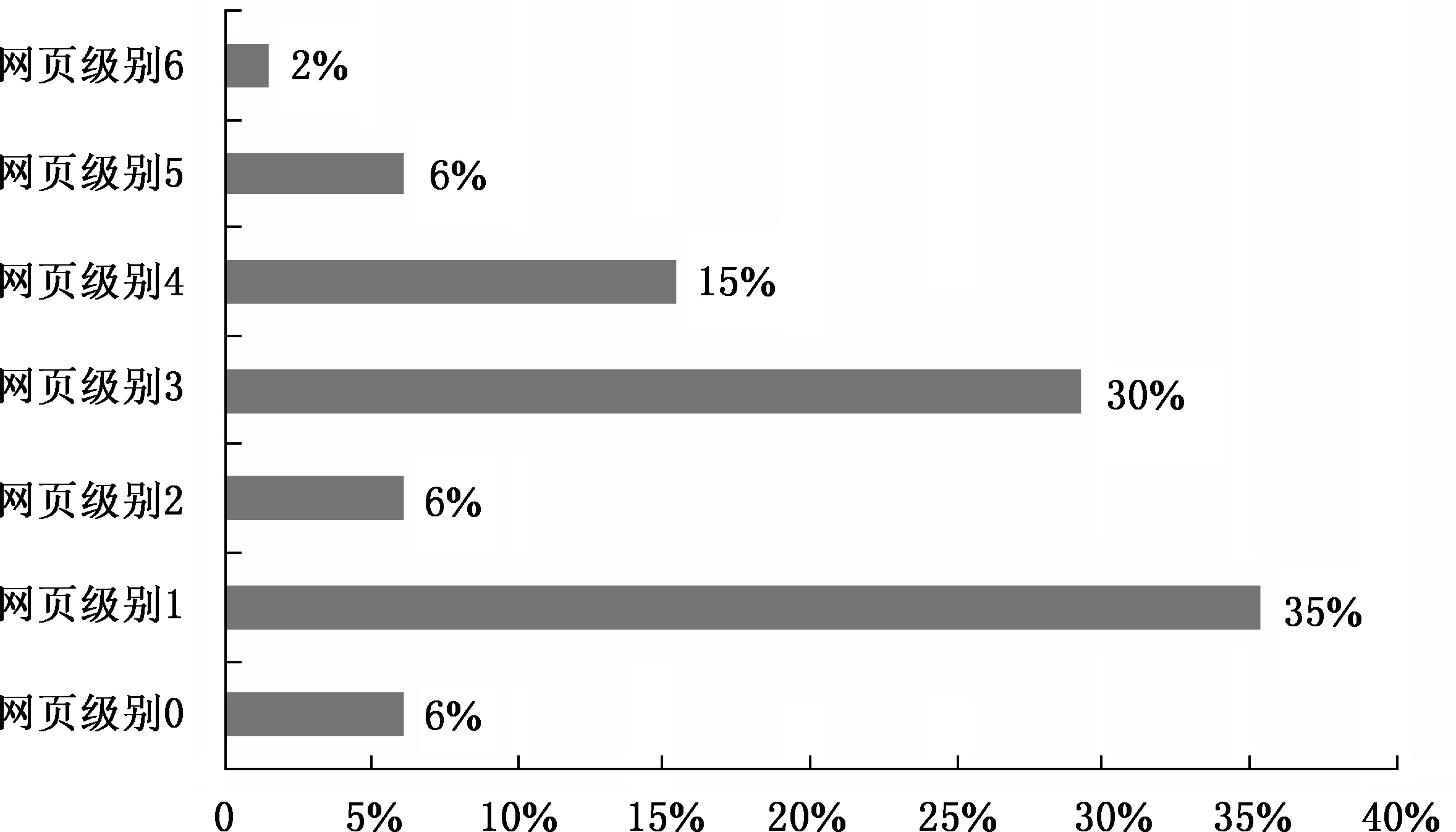 一一據調查統計,目前我國僅有65%的物流園區具有自己的網頁,物流園區對自身網站建設的重視程度有待提高。在物流園區評價中,我們選取網頁級別作為衡量園區網站建設水平和服務能力的度量指標。網頁級別(PR值)是當前國際上流行的用來標識網頁等級和重要性的指標。級別從0到10級,10級為滿分,PR值越高說明該網頁越受歡迎(越重要)。通過利用專用工具對各物流園區網頁級別查詢并統計,可以看出網頁級別為1的物流園區占35%,網頁級別為3的占30%,而網頁級別為6的僅占2%。目前,我國物流園區PR值尚無超過6的高水平網頁,相反,卻有6%的物流園區網頁PR值為0,具體分布情況如圖14所示。