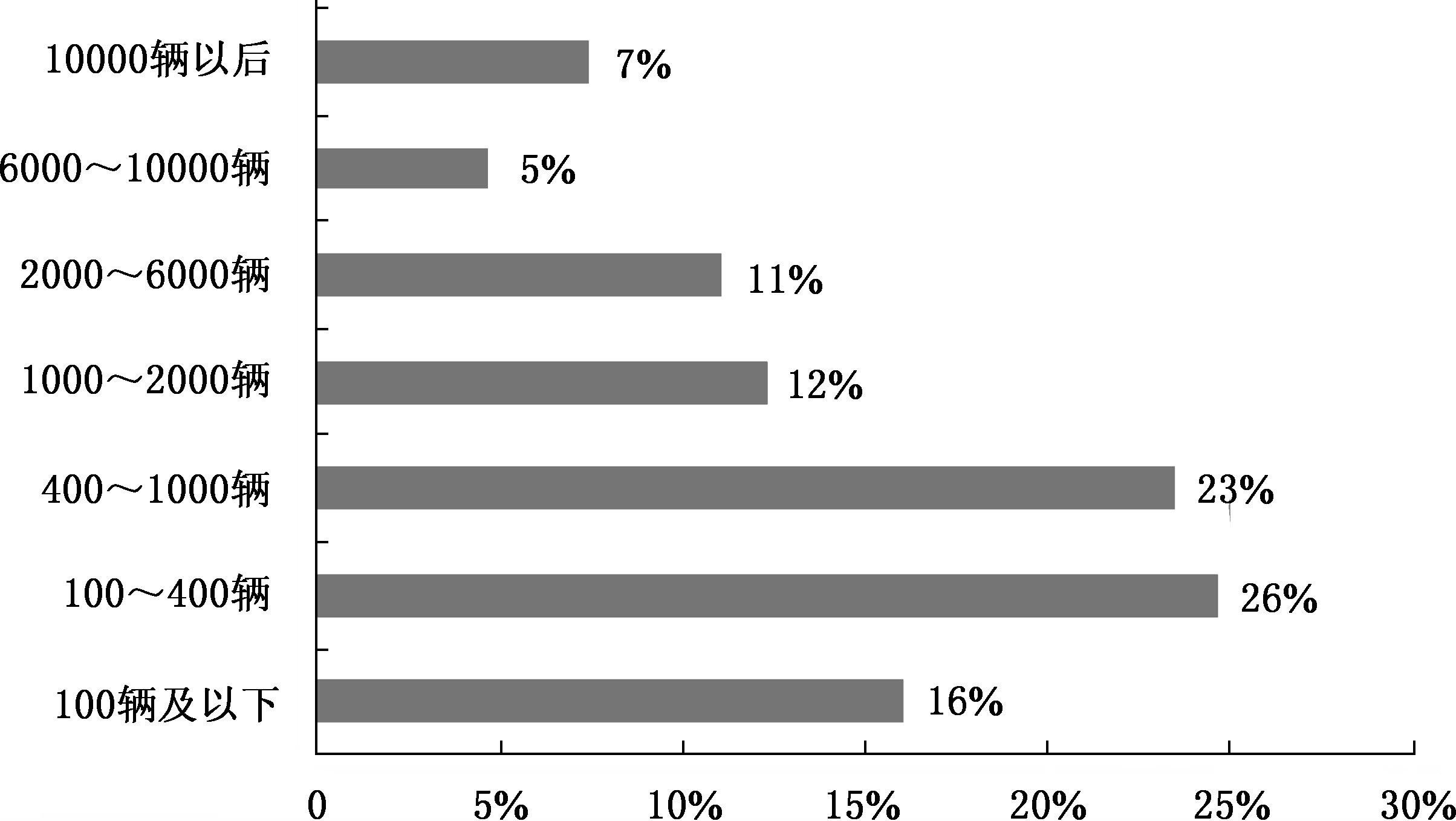 一一根據統計數據,物流園區平均自有車輛為368輛,平均整合社會車輛10939輛,圖16是我國物流園區貨運車輛規模分布情況。