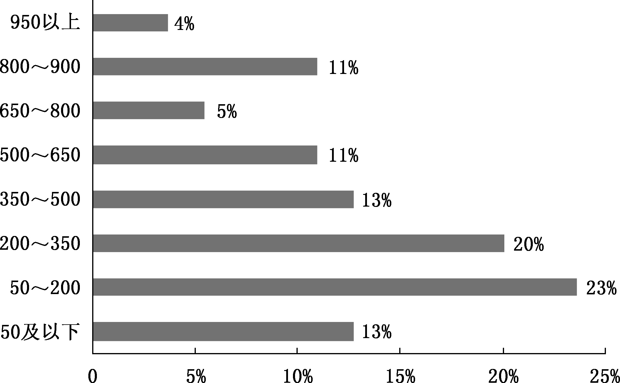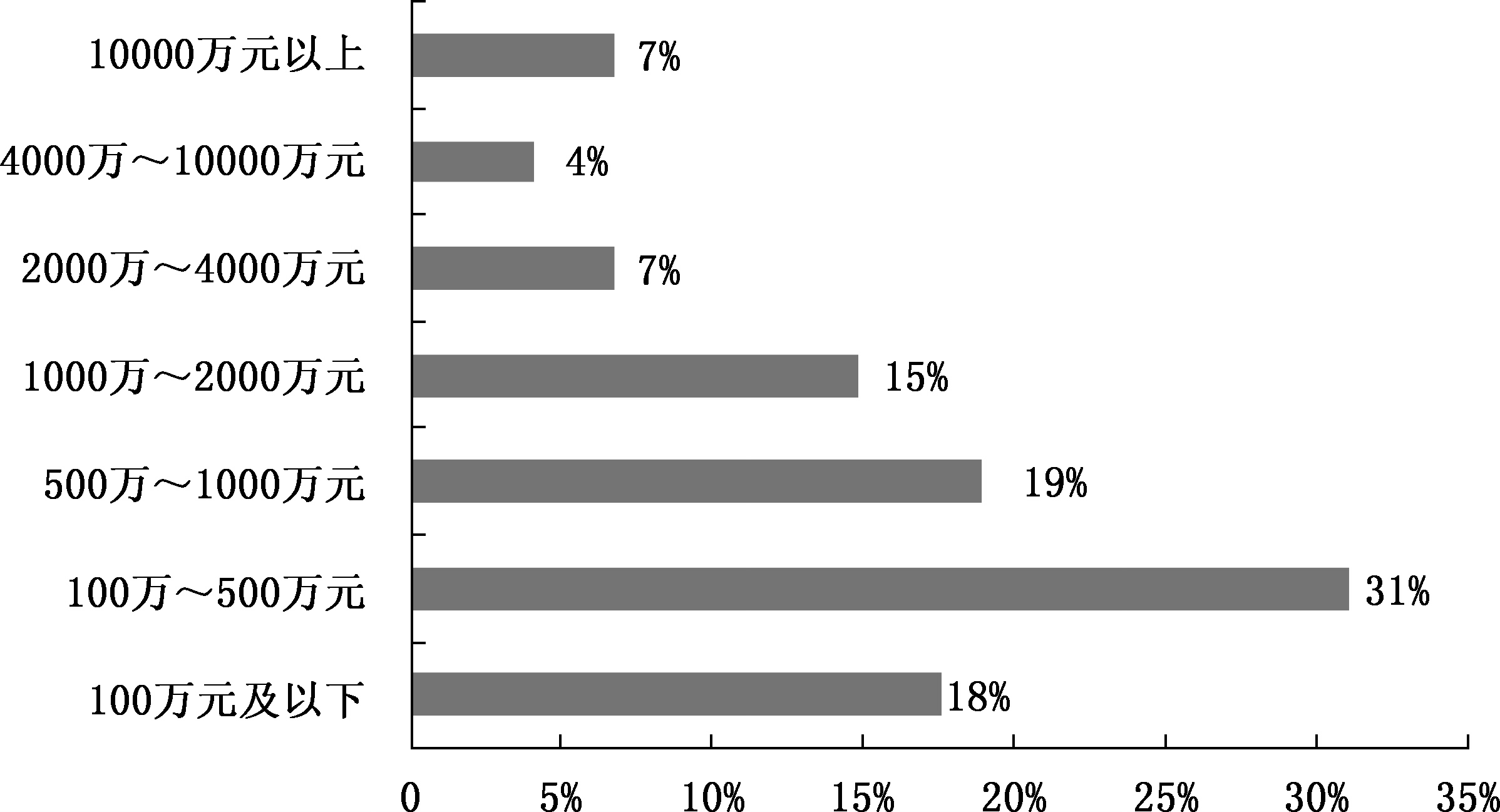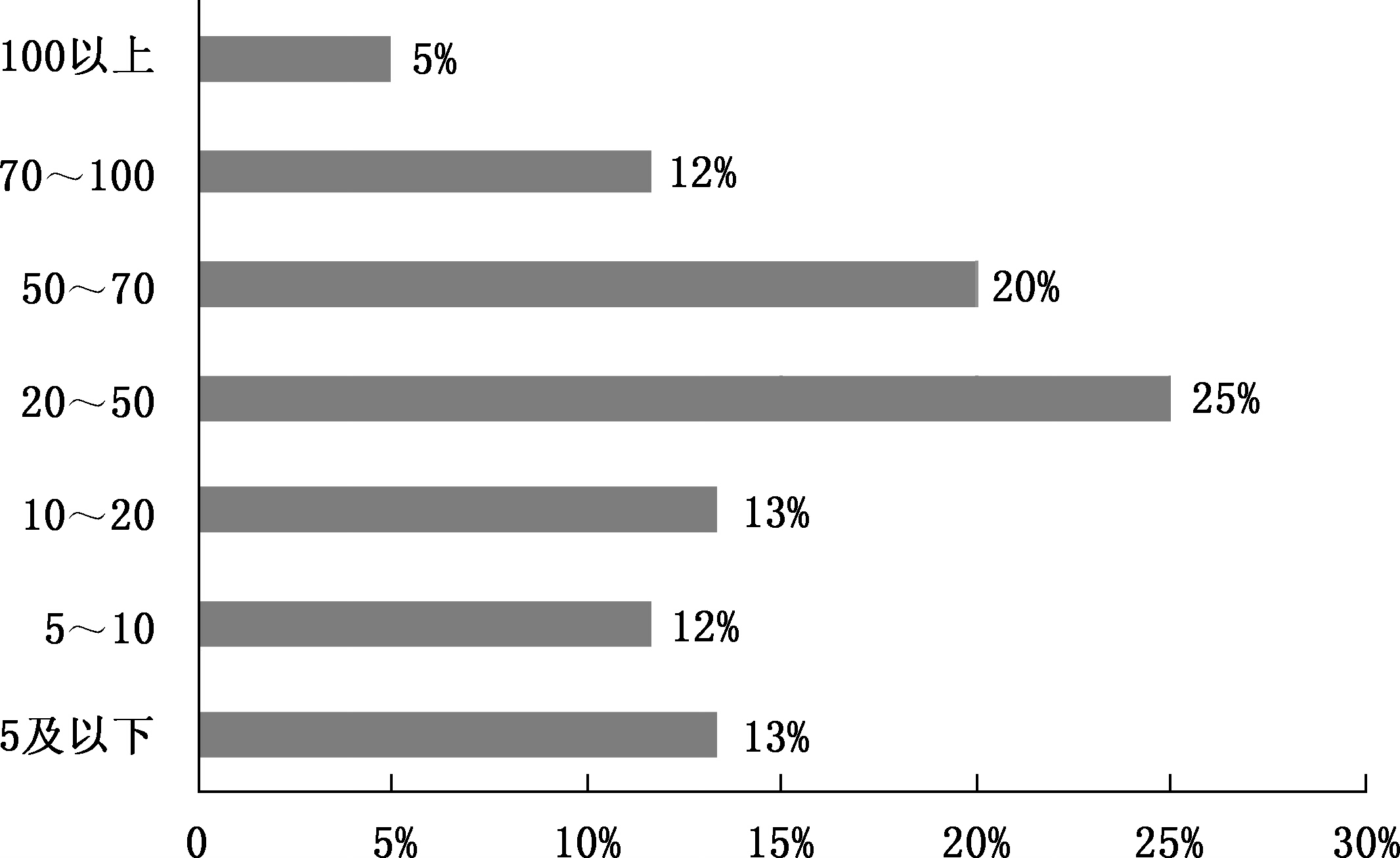 物流園區公共信息平臺投入占園區實際投資的比例平均為7.9%,而園區軟件系統投入占公共信息平臺投入的比例平均為54.6%。物流園區公共信息平臺投入規模分布情況如圖13所示。