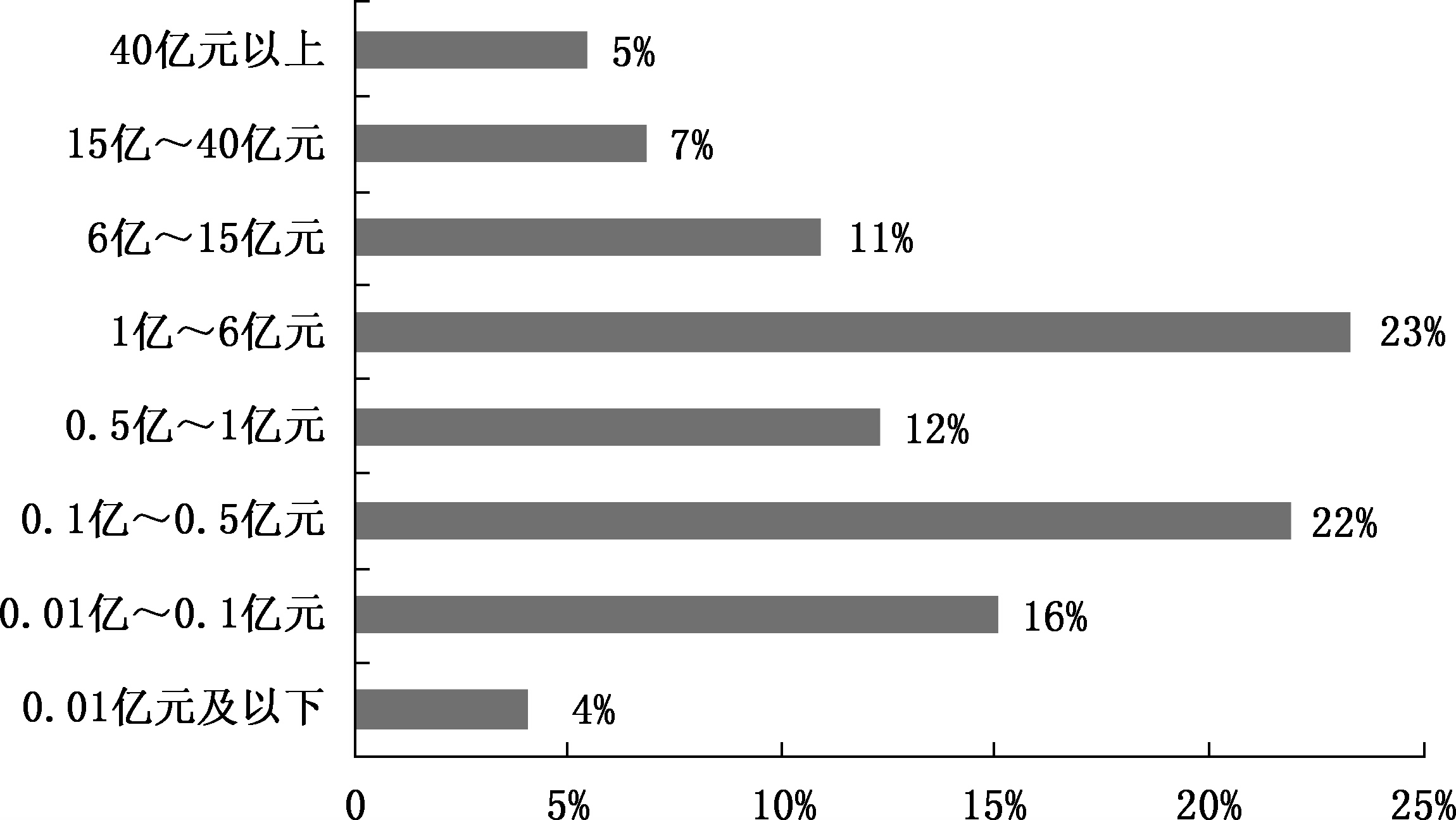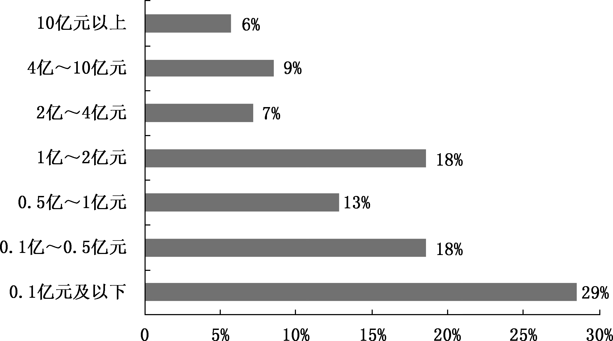 一一經統計,我國物流園區自身營業收入差別較大,2014年平均營業收入為5.7億元,其中有12%的物流園區自身營業收入超過了15億元,仍有4%的物流園區自身營業收入不超過100萬元,具體如圖19所示。
