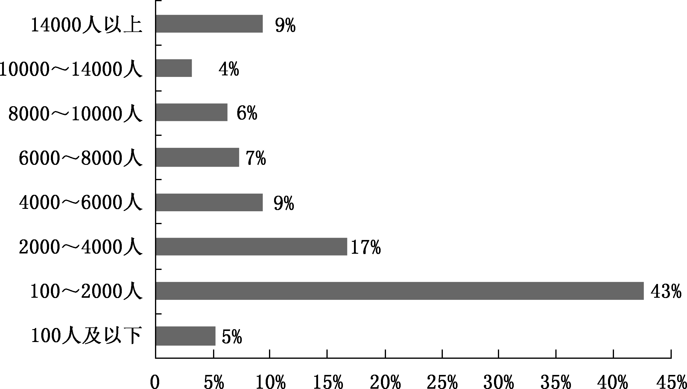 一一就業規模指園區管理機構人數與入駐企業中從事物流活動的就業人數之和。根據本次統計,2014年我國物流園區平均就業人數為5900人,具體分布如圖22所示。