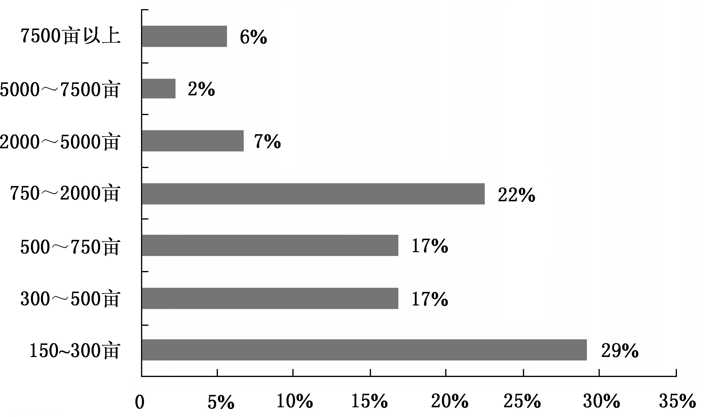 一一根據《物流園區服務規范及評估指標》(GB/T 30334—2013)(以下簡稱《規范》),建議物流園區占地面積不小于0.5平方公里(750畝)以上。從本次統計來看,實際占地面積在150~750畝的物流園區占63%,與《規范》建議的占地面積標準相差較大;另外,占地7500畝以上的超大型園區占6%,如圖5所示。