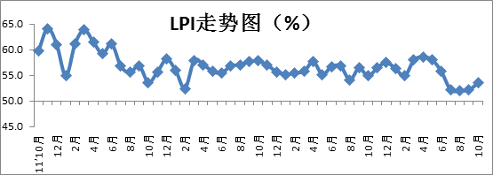 中國物流與采購聯合會發布的2015年10月份中國物流業景氣指數(LPI)為53.5%,比上月升1.3個百分點。各分項指數中,除主營業務利潤指數和主營業務成本指數等較上月回落,其他分項指數較上月有不同程度回升。