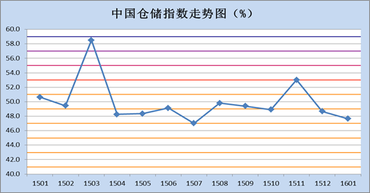 中國物流與采購聯(lián)合會與中儲發(fā)展股份有限公司聯(lián)合調(diào)查的2016年1月中國倉儲指數(shù)為47.7%,較上月回落1.0個百分點。各分項指數(shù)中,除業(yè)務活動預期指數(shù)、平均庫存周轉次數(shù)指數(shù)、延伸業(yè)務量指數(shù)出現(xiàn)回升外,其余指數(shù)均有不同程度的回落。