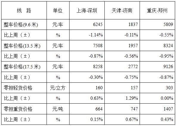 各車型指數環比均有所回落,其中整車指數回落幅度明顯高于零擔指數。本周,整車指數為890.5點,比上周回落0.5%,同比回落14.8%;零擔輕貨指數為1075.7點,比上周回落0.2%,同比回升1.4%;零擔重貨指數為1054.8點,比上周回落0.2%,同比小幅回升0.1%。