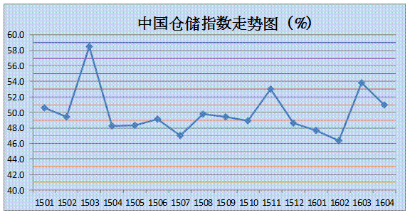 中國物流與采購聯合會與中儲發展股份有限公司聯合調查的2016年4月中國倉儲指數為51.0%,較上月回落2.8個百分點,連續倆月位于榮枯線上。各分項指數中,收費價格指數、企業員工指數及業務活動預期指數出現回升,其余指數均有不同程度的回落。