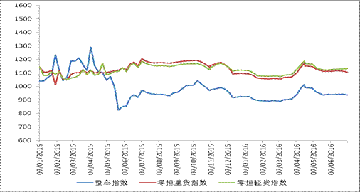 各車型指數漲跌不一,其中整車、零擔重貨運輸指數環比回落,零擔輕貨運輸指數環比回升。本周,整車指數為937.1點,環比回落0.7%,比上年同期下降3.7%,但比年初回升1.3%;零擔重貨指數為1106.8點,環比回落0.5%,同比下降8.2%;零擔輕貨指數為1132.7點,環比回升0.2%,但同比回落4.6%。