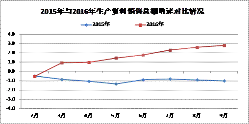 2月份,生產資料銷售總額同比下降0.5%,3月份止跌回升0.9%,隨后增速呈現逐月擴大走勢,6、7月份分別增長2.0%和2.3%。而去年各月銷售總額均呈同比下降走勢,降幅在1個百分點左右。初步預測,1-9月份生產資料銷售總額達到44萬億,同比增長2.8%。按可比價格計算,比去年同期增長6.9%,增速較上半年提高0.3個百分點。