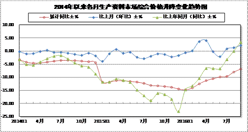 三季度,在經濟穩中有升、市場需求轉旺的背景下,生產資料市場價格呈現環比連續回升態勢。7月份,市場價格環比上漲0.84%,8月環比上漲1.29%,9月環比上漲2.09%,增幅逐月擴大。同比來看,今年以來市場價格同比降幅逐月縮小,至9月份止跌回升3.39%,結束了2012年1月份以來持續下降的趨勢,時隔57個月再次轉正。1-9月份,生產資料價格累計同比下降6.85%,降幅較上半年縮小3個百分點。價格同比上漲是較為積極的信號,體現了市場需求好轉的拉動作用。
