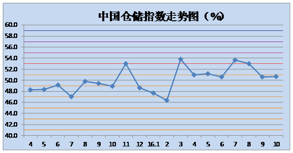 中國物流與采購聯合會與中儲發展股份有限公司聯合調查的2016年10月中國倉儲指數為50.7%,較上月回升0.1個百分點,連續八個月位于擴張區間。各分項指數中,設施利用率指數、主營業務成本指數、期末庫存指數及企業員工指數較上月有所回升,其余指數均有不同程度的回落。