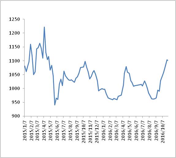 本周(2016年10月31日~11月4日),由中國物流與采購聯合會和林安物流集團聯合調查的中國公路物流運價指數1101.3點,在連續四周回升后小幅回調,比上周回落0.2%。