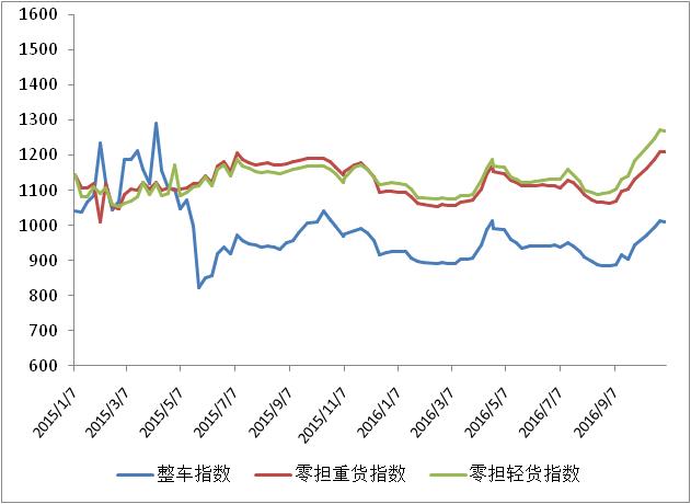 各車型指數環比均有不同程度回落,其中整車指數、零擔重貨運輸指數環比回落幅度略高于零擔輕貨指數。本周,整車指數為1010.6點,環比回落0.2%,但比年初回升9.2%;零擔輕貨指數為1269.3點,環比回落0.1%;零擔重貨指數為1208.5點,環比回落0.2%。