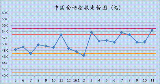 中國物流與采購聯(lián)合會與中儲發(fā)展股份有限公司聯(lián)合調查的2016年11月中國倉儲指數(shù)為54.5%,較上月回升3.8個百分點,連續(xù)九個月位于擴張區(qū)間,并創(chuàng)2015年3月份以來的新高。各分項指數(shù)中,業(yè)務利潤指數(shù)及企業(yè)員工指數(shù)較上月有所下降,其余指數(shù)均有不同程度的回升。