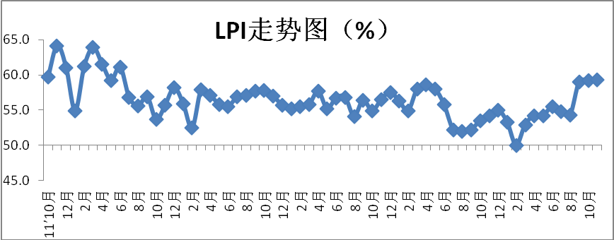 新訂單指數回升,物流需求持續旺盛。11月份,新訂單指數為56.6%,比上月回升0.5個百分點,該指數連續三個月位于56%以上高景氣區間,顯示出物流需求持續旺盛。