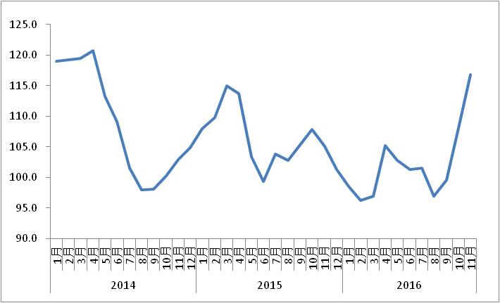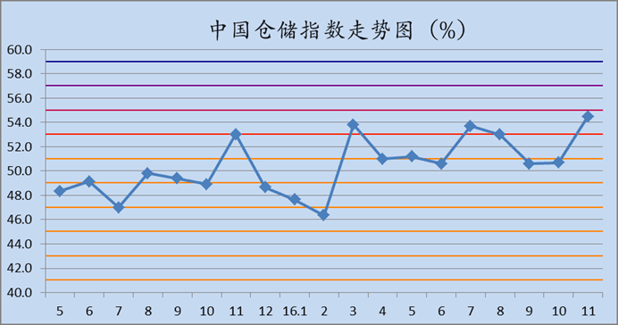 中國物流與采購聯合會發布的2016年11月份中國物流業景氣指數為59.3%較上月回升0.1個百分點;中國倉儲指數為54.5%,較上月回升3.8個百分點;中國公路物流運價指數為116.8點,比上月回升8%。