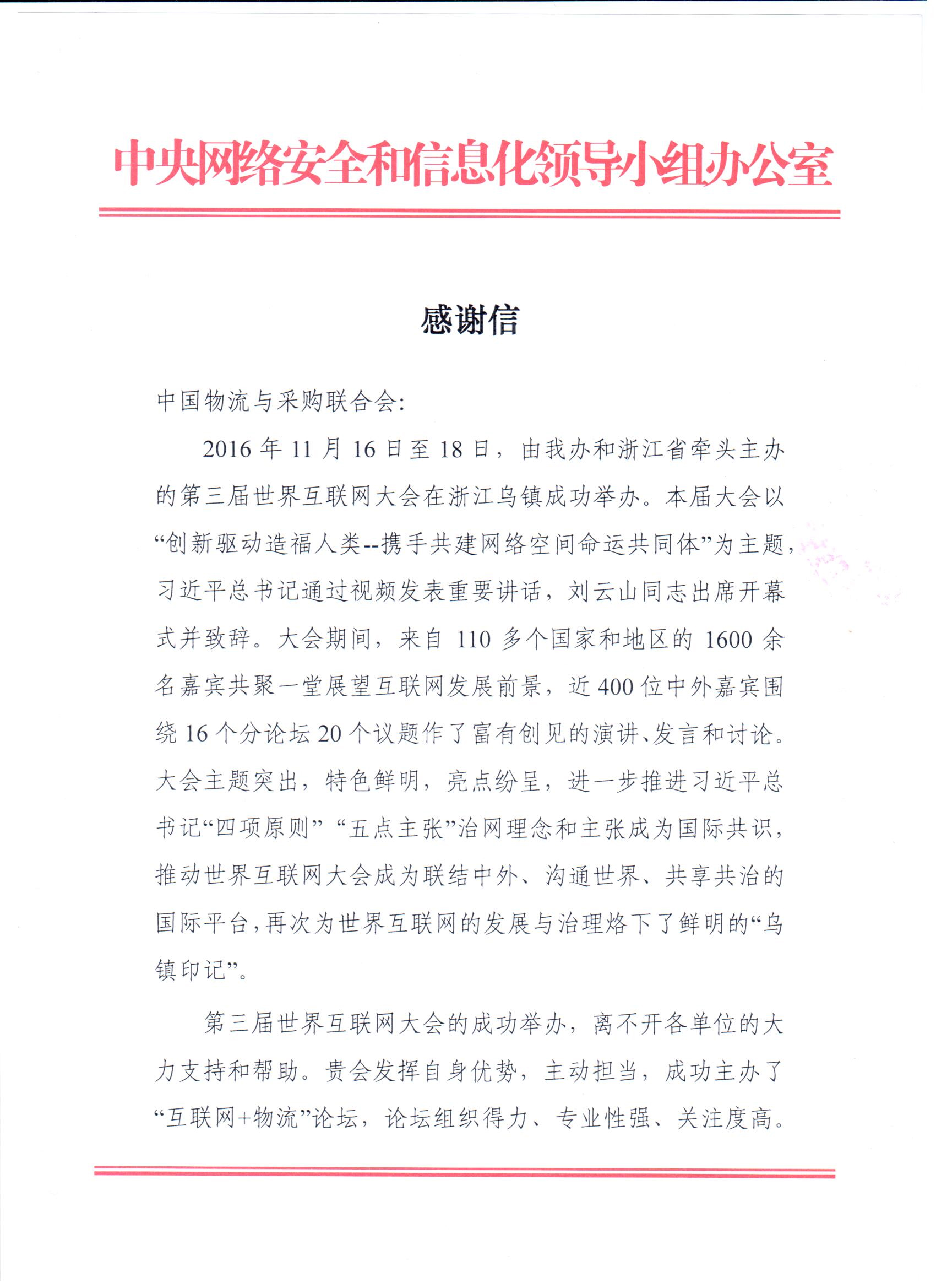 2016年11月16日至18日,第三屆世界互聯(lián)網(wǎng)大會在浙江烏鎮(zhèn)召開。來自110多個國家的1600余名嘉賓共聚一堂展望互聯(lián)網(wǎng)發(fā)展前景。其中由中國物流與采購聯(lián)合會主辦的“互聯(lián)網(wǎng)+物流”論壇,是本屆大會中唯一個由社會團體獨立主辦的論壇。論壇以“互聯(lián)網(wǎng)+物流創(chuàng)新與實踐--實現(xiàn)經(jīng)濟發(fā)展轉型升級”為主題,何黎明會長、蔡進副會長、菜鳥網(wǎng)絡童文紅等30余位嘉賓和150名代表出席了會議,取得較好的效果。整個論壇的籌備、策劃、實施和總結等工作歷時三個月,表現(xiàn)出了高度的專業(yè)性和組織協(xié)調能力,受到了中央網(wǎng)信辦的表彰。