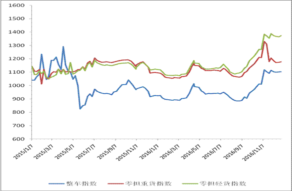 各車型指數環比均有不同程度回升,其中零擔指數回升幅度高于整車指數,在零擔指數中零擔輕貨指數回升幅度高于零擔重貨指數。其中,整車指數為1104.0點,環比回升0.2%,比上年同期增長19.3%;零擔輕貨指數為1373.1點,環比回升0.6%;零擔重貨指數為1176.8點,環比回升0.3%。