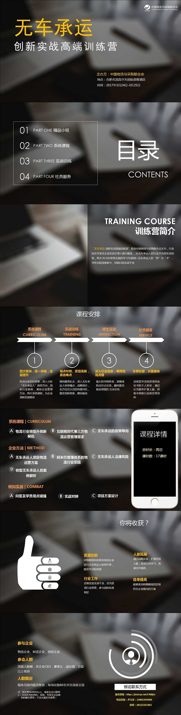 3月24日-25日,中國物流與采購聯(lián)合會首次在合肥舉辦“無車承運(yùn)創(chuàng)新實戰(zhàn)高端訓(xùn)練營”,邀請行業(yè)知名專家、企業(yè)實戰(zhàn)主理人擔(dān)任培訓(xùn)講師,以系統(tǒng)課程、實戰(zhàn)訓(xùn)練、觀點(diǎn)交流緊密結(jié)合的方式,兩天17課時深入研習(xí)無車承運(yùn)的“術(shù)”與“勢”,共贏“無車承運(yùn)時代”。