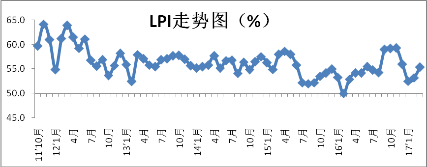 中國物流與采購聯(lián)合會發(fā)布的2017年4月份中國物流業(yè)景氣指數(shù)為58.2%較上月回升2.8個百分點;中國倉儲指數(shù)為55.1%,較上月回升0.6個百分點;中國公路物流運價指數(shù)為106.3點,比上月回落1.5%。
