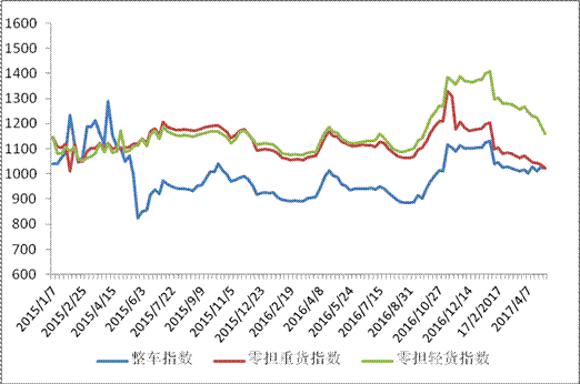 各車型指數均有不同程度回落。其中,零擔指數回落幅度高于整車指數指數。在零擔指數中,零擔輕貨指數回落幅度明顯高于零擔重貨指數。本周,整車指數為1022.6點,環比回落0.3%,比年初回落7.4%;零擔輕貨指數為1160.1點,環比回落2.9%;零擔重貨指數為1021.7點,環比回落1.6%。