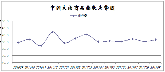 9月份,大宗商品供應(yīng)指數(shù)為106.0%,升幅較上月擴(kuò)大4.9個(gè)百分點(diǎn),連續(xù)八個(gè)月呈現(xiàn)上升態(tài)勢(shì),顯示在高利潤(rùn)刺激下,企業(yè)生產(chǎn)活動(dòng)趨于加快,市場(chǎng)供應(yīng)量整體明顯增加。各主要商品中,鋼鐵、鐵礦石、成品油、汽車供應(yīng)增加,特別是成品油增加明顯,鋼鐵和汽車供應(yīng)止跌回升,鐵礦石供應(yīng)增速則持續(xù)放緩;有色金屬、原煤和化工供應(yīng)繼續(xù)減少,分別較上月減少2.3個(gè)百分點(diǎn)、1.7個(gè)百分點(diǎn)和2.6個(gè)百分點(diǎn)。