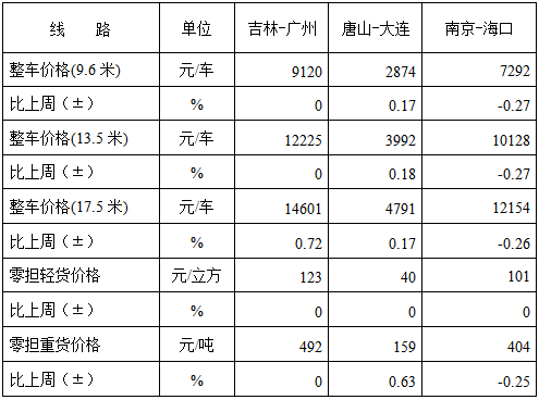 分車型看,各車型指數環比均有不同程度回落。其中,整車指數為987.00點,比上周回落0.04%;零擔重貨指數為986.24點,比上周回落0.04%;零擔輕貨指數為967.95點,比上周回落0.03%。