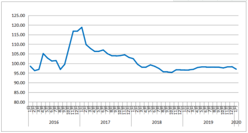 2020年1月份,由中國物流與采購聯(lián)合會和林安物流集團(tuán)聯(lián)合調(diào)查的中國公路物流運(yùn)價(jià)指數(shù)為97點(diǎn),比上月回落1.33%,比去年同期增長0.5%。月內(nèi)各周指數(shù)整體呈回落趨勢,其中第一、三、四周環(huán)比回落,第二、五周環(huán)比回升。