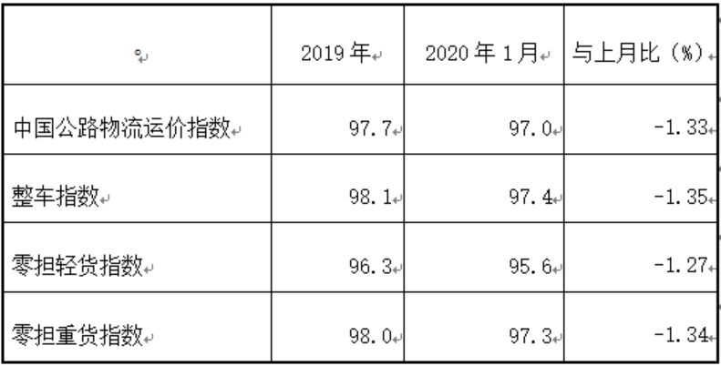表1 2020年1月中國公路物流運(yùn)價(jià)指數(shù)表