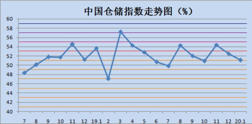 中國物流與采購聯(lián)合會與中儲發(fā)展股份有限公司聯(lián)合調查的中國倉儲指數,2020年1月份為51.1%,較上月回落1.4個百分點。各分項指數中,期末庫存指數較上月有所回升,其余指數均有不同程度的回落。