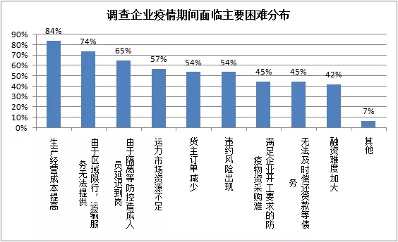 被調查企業中,84%的企業反映生產經營成本提高,調研企業反映,受開工一再延遲影響,停工期間企業仍需支付停車費、場地租金、員工工資、社保等固定成本,還需支付貸款利息及相關稅費,資金壓力較大。企業開工后由于市場運力不足、運輸時效延遲等問題導致外請車輛成本上漲,各項防疫要求增加日常運營成本投入,更抬高了企業生產經營成本。