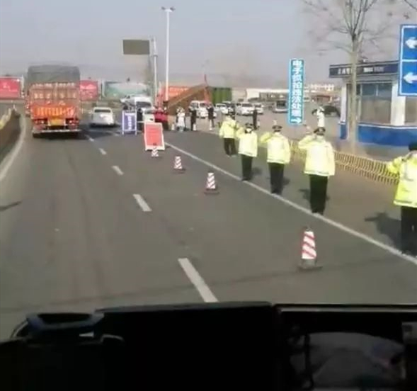 圖:1月30日,安心驛站用戶趙崇正受山東臨沂蘭陵縣政府的委托,運送大蒜到武漢。返程下高速時候,交警路政站在路邊給他們敬禮。他不禁熱淚盈眶,因為對卡車司機來說“這是最高的禮儀”。