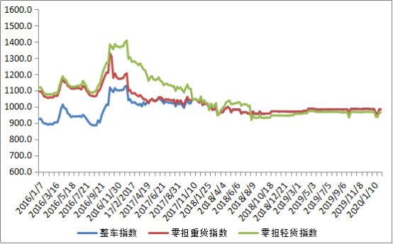 分車型看,各車型指數(shù)漲跌不一。其中,整車指數(shù)為983.76點(diǎn),比上周回落0.04%;零擔(dān)重貨指數(shù)為983.39點(diǎn),比上周回落0.03%;零擔(dān)輕貨指數(shù)為964.03點(diǎn),比上周回升0.01%。