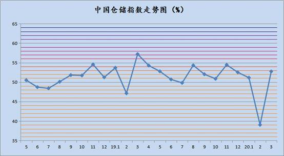 中國物流與采購聯合會與中儲發展股份有限公司聯合調查的中國倉儲指數,2020年3月份為52.7%,較上月回升13.7個百分點。各分項指數中,期末庫存指數較上月有所回落,其余指數均有不同程度的回升。