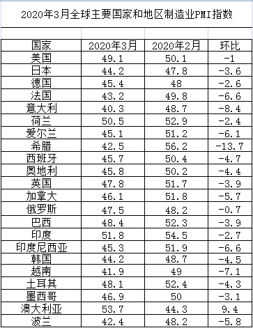 2020年3月份全球主要國家制造業PMI