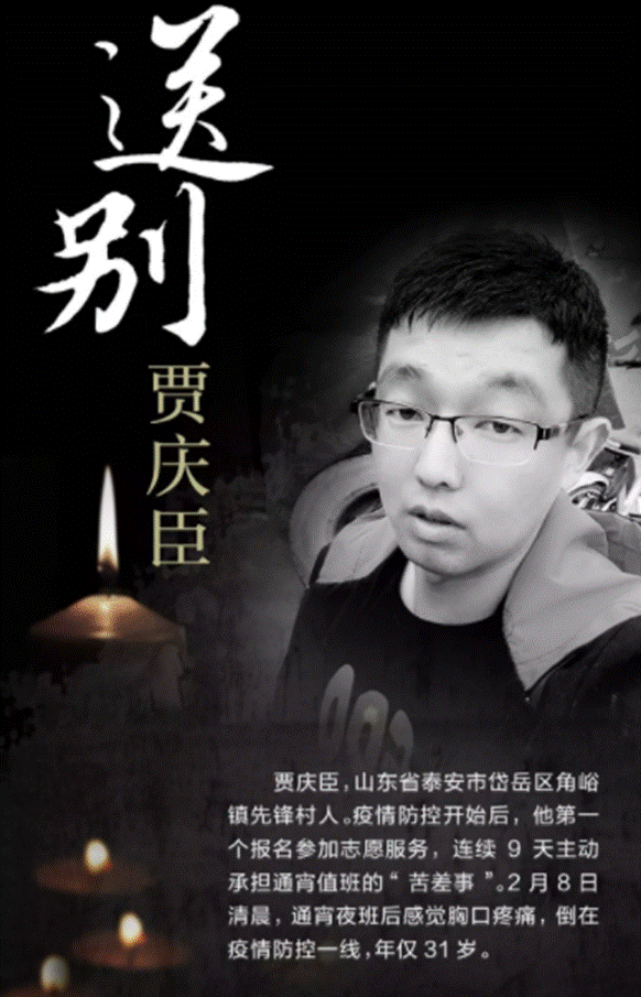 2月8日一早,剛剛值了一個通宵的賈慶臣感覺胸口疼得厲害,還沒來得及去醫院,他就倒在了戰“疫”一線,生命永遠定格在了31歲。